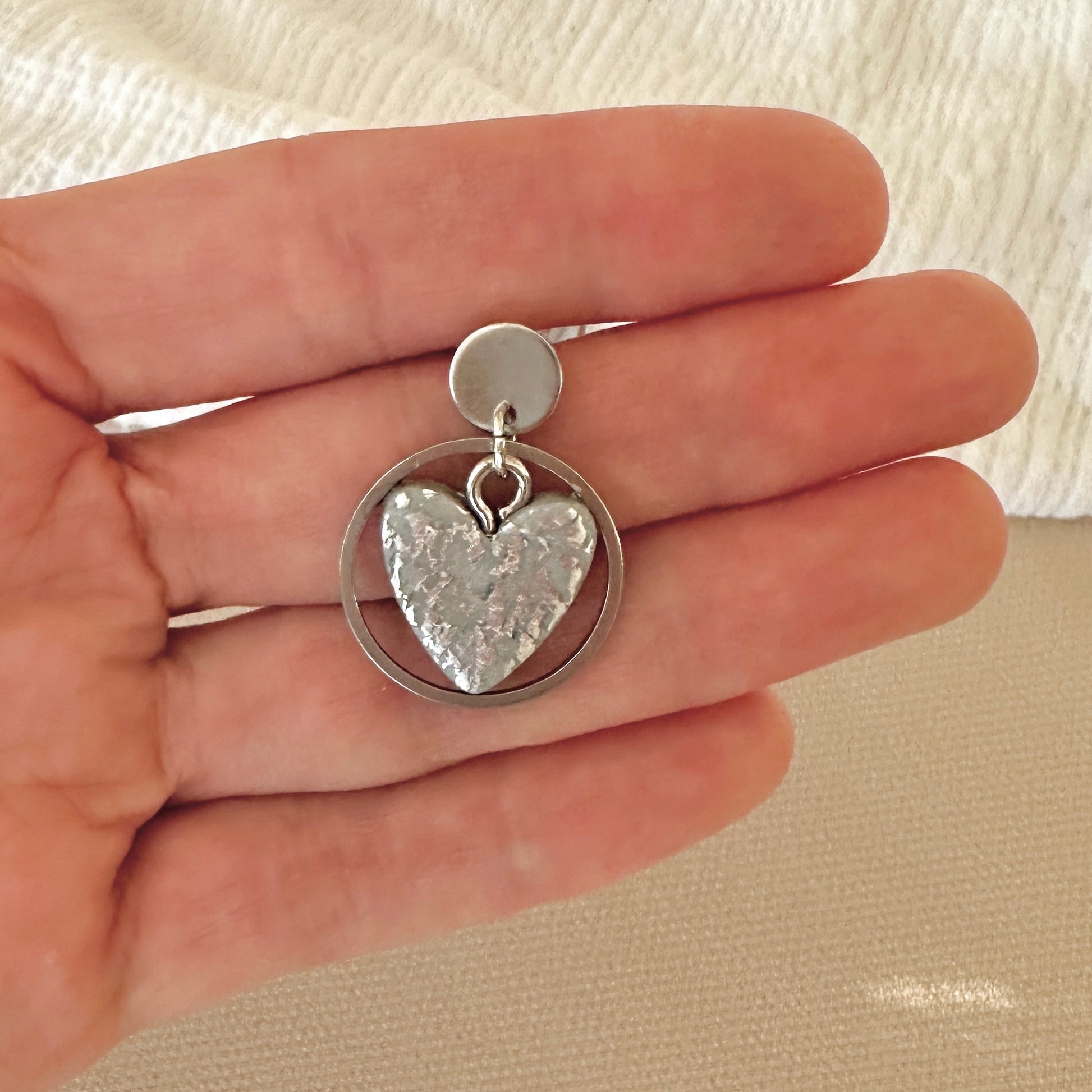Diese handgefertigten Ohrringe vereinen einen strukturierten Herzanhänger in Silberoptik mit klaren, runden Formen – ein Design, das Stärke und Sanftheit zugleich ausstrahlt.