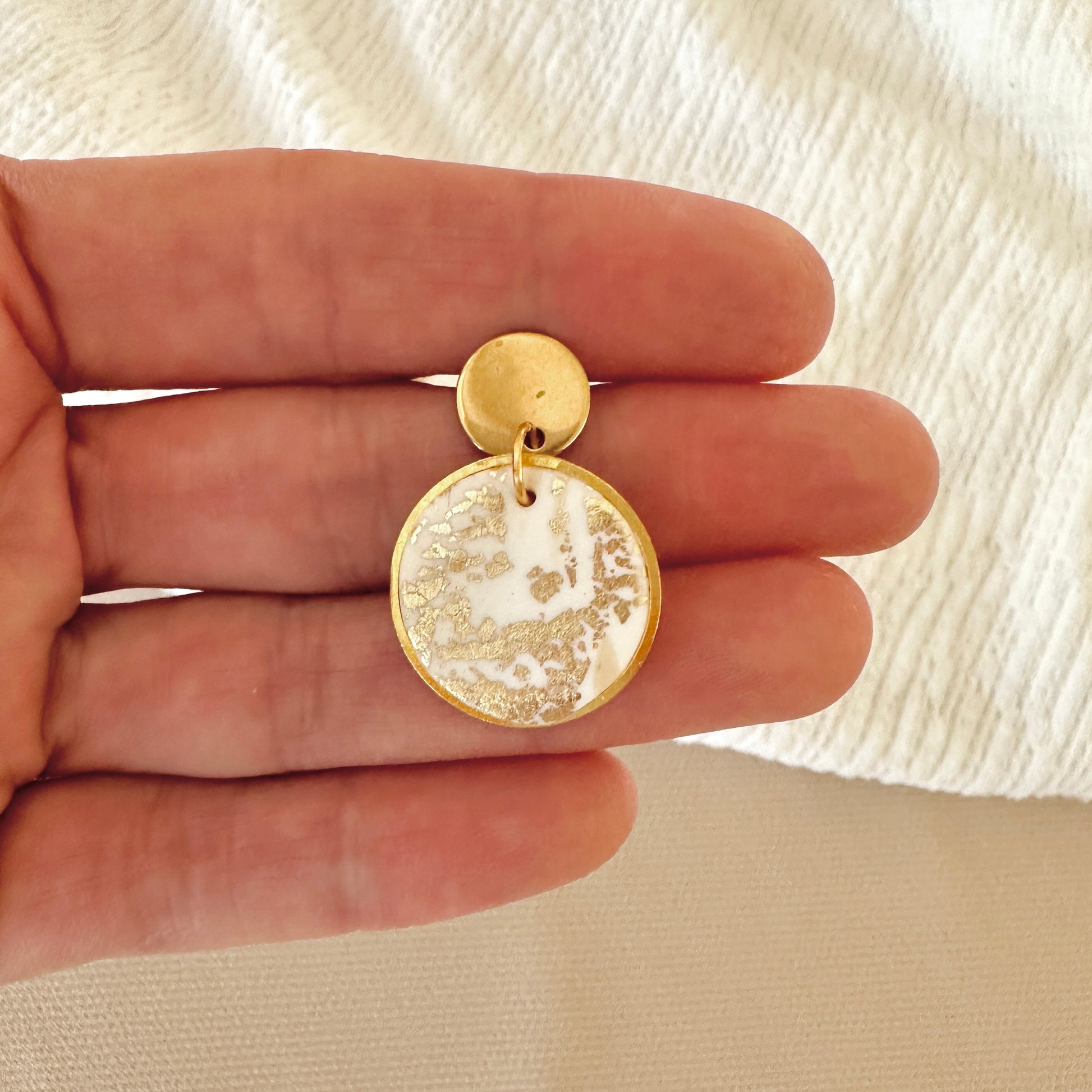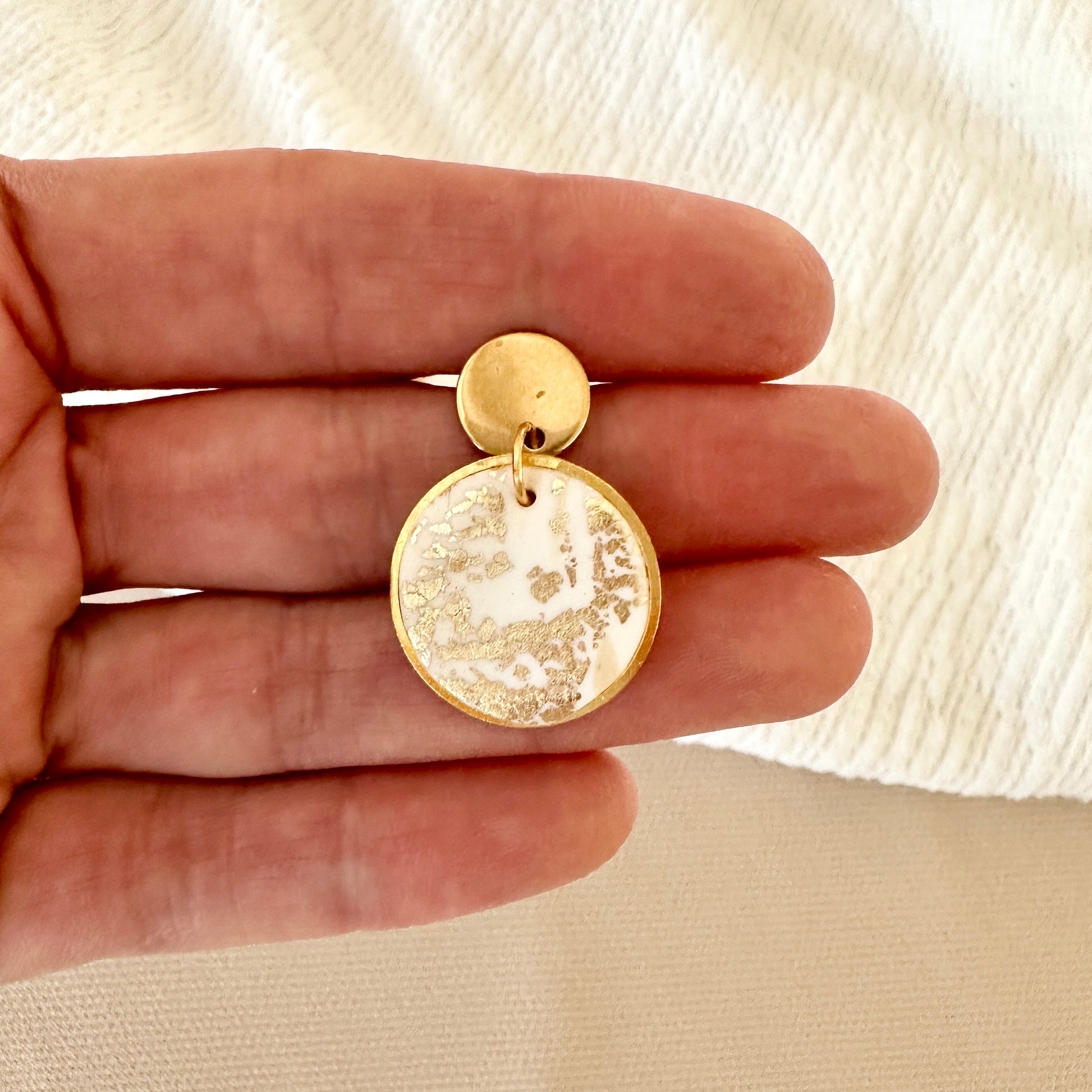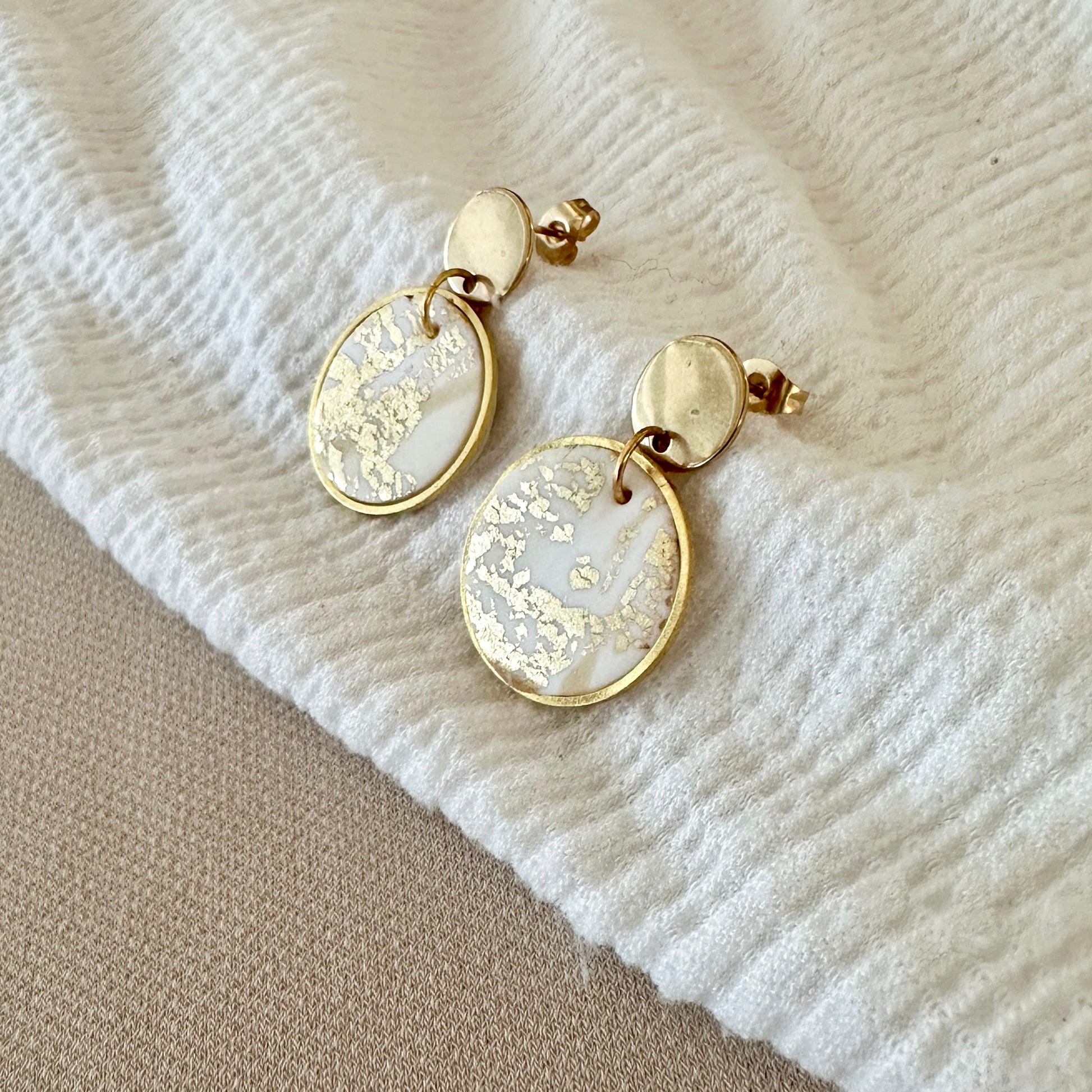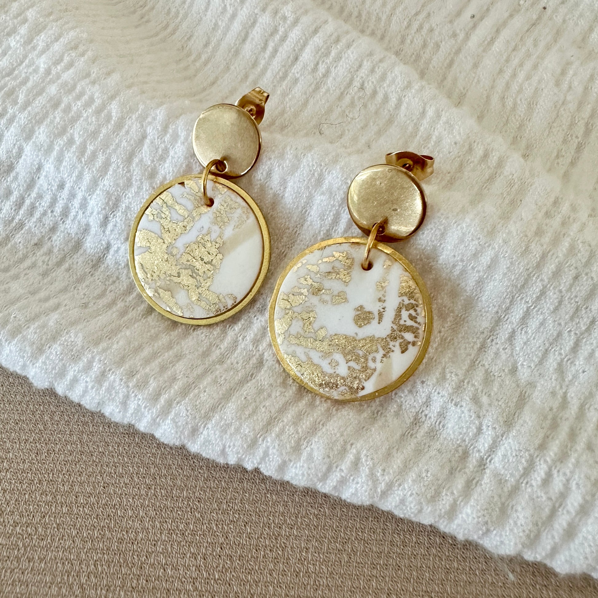Die sanft glänzenden Plättchen mit feinen Goldflocken sind von einem goldfarbenen Ring eingerahmt und machen jedes Paar zu einem echten Unikat. Dank der leichten Modelliermasse und den hochwertigen Edelstahlsteckern tragen sich die Ohrringe angenehm – auch über viele Stunden.