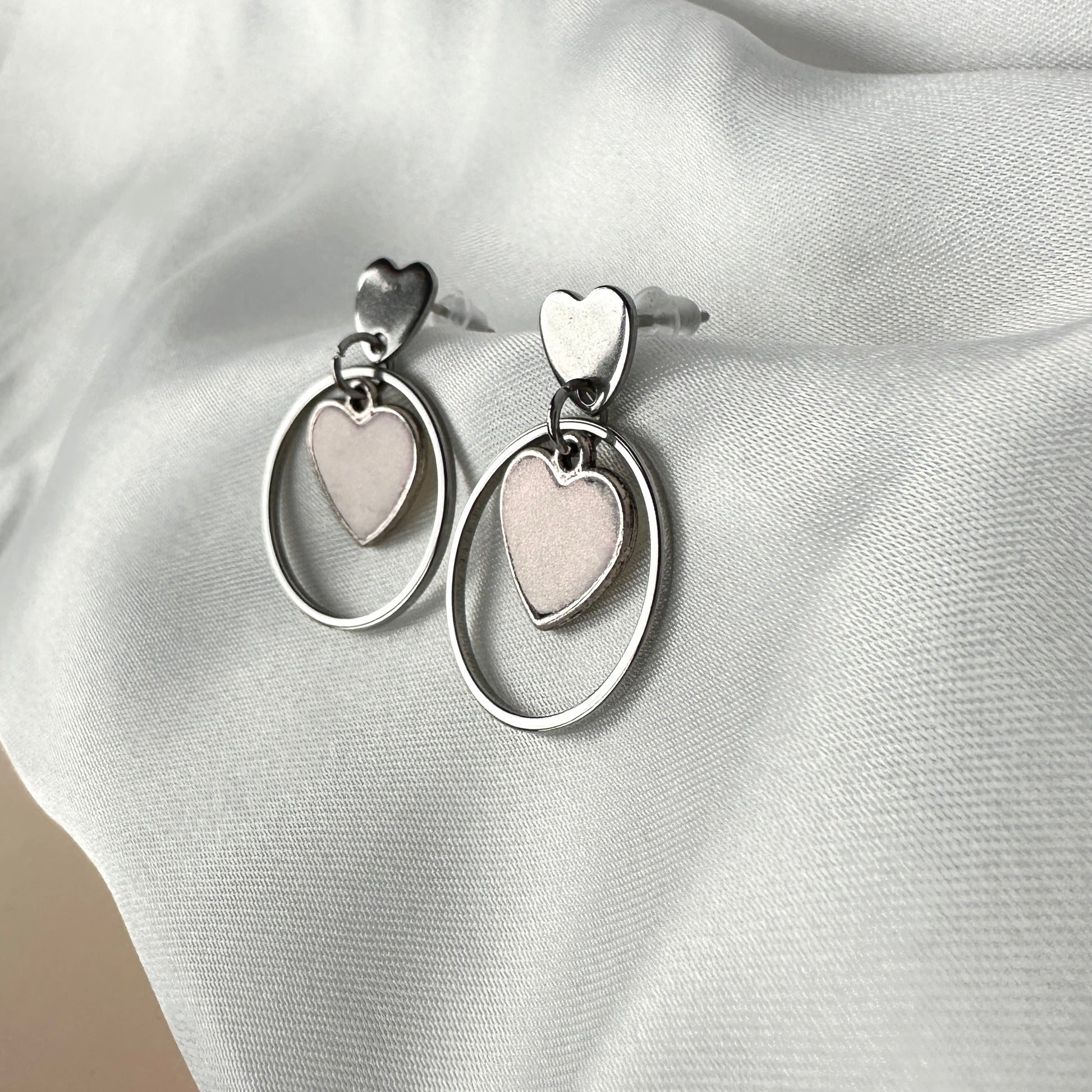 Diese Ohrringe verbinden kunstvolle Handarbeit mit edlem Glanz. Das innere Herz ist liebevoll von Hand gefertigt und besitzt eine einzigartige, perlgläzende Oberfläche, die im Licht wunderschön schimmert.