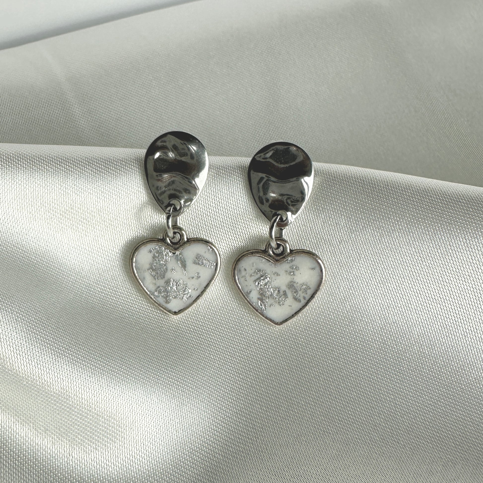 Diese handgefertigten Ohrringe vereinen einen schimmernden Herzanhänger mit Silberelementen mit klaren, runden Formen – ein Design, das Stärke und Sanftheit zugleich ausstrahlt.
