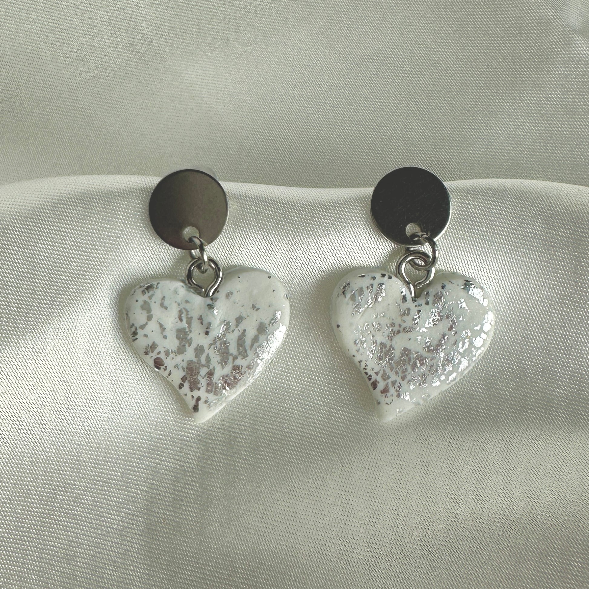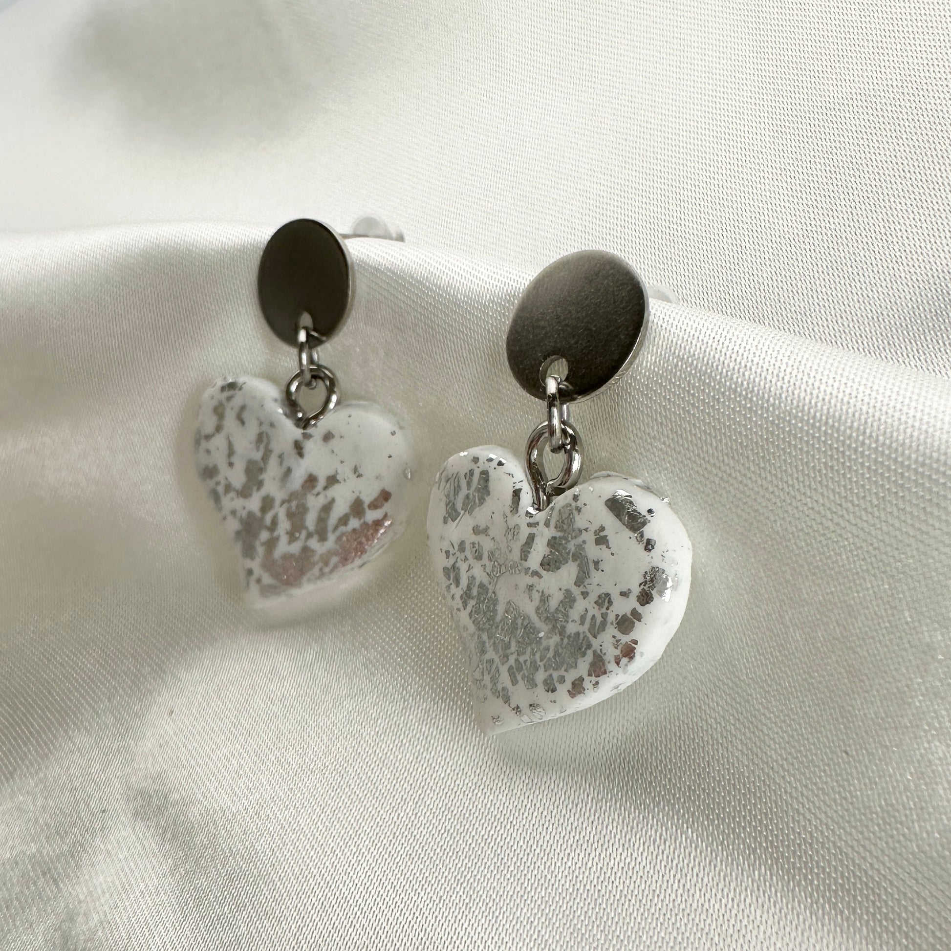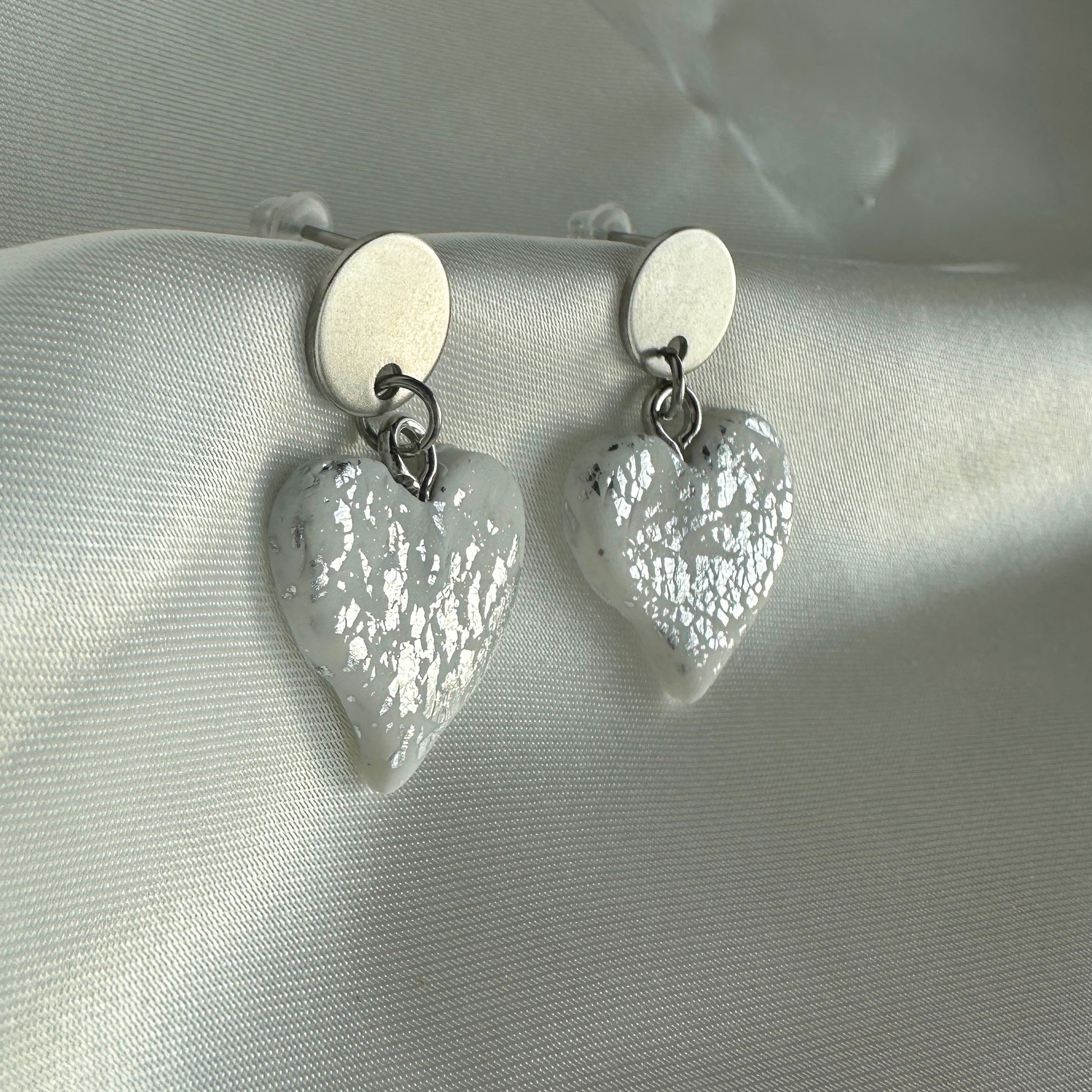 Diese Ohrringe verbinden kunstvolle Handarbeit mit edlem Glanz. Das weisse Herz ist liebevoll von Hand gefertigt. Es besitzt eine einzigartige Oberfläche mit Silberelementen, die im Licht wunderschön schimmert. Jeder einzelne ist ein kleines Unikat.